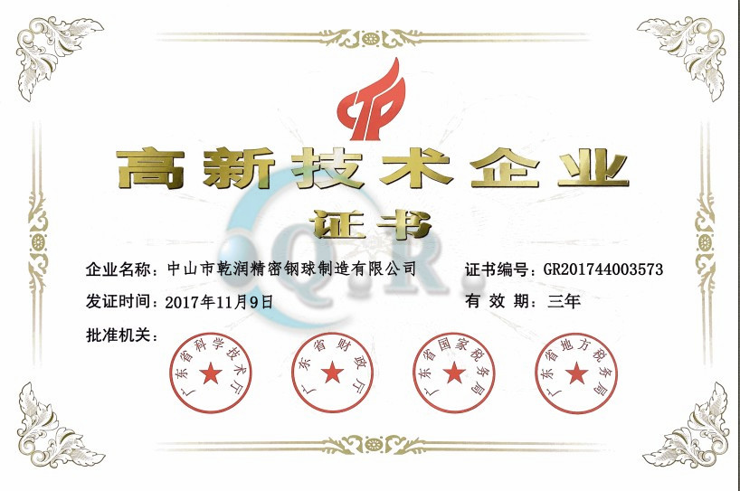 中山乾潤精密鋼球再次獲得高新技術企業榮譽稱號